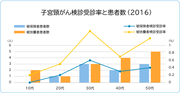 子宮頸がんは、妊娠・出産の適齢期である20~30歳代に増えており、発見が遅れると子宮を失うことになります。定期的に検診を受けることでがんの発症を予防することが可能ですが、日本の受診率は低く、防げるがんが放置されています。当健保も同じ傾向にありますので、大切な子宮を守るために、若い世代も子宮頸がん検診を受けましょう。