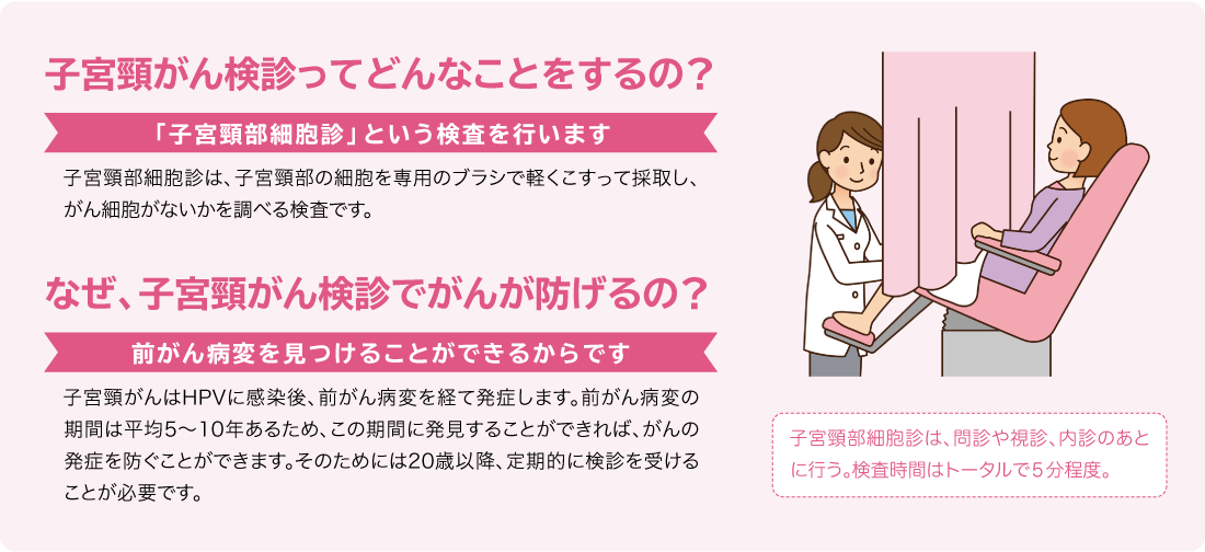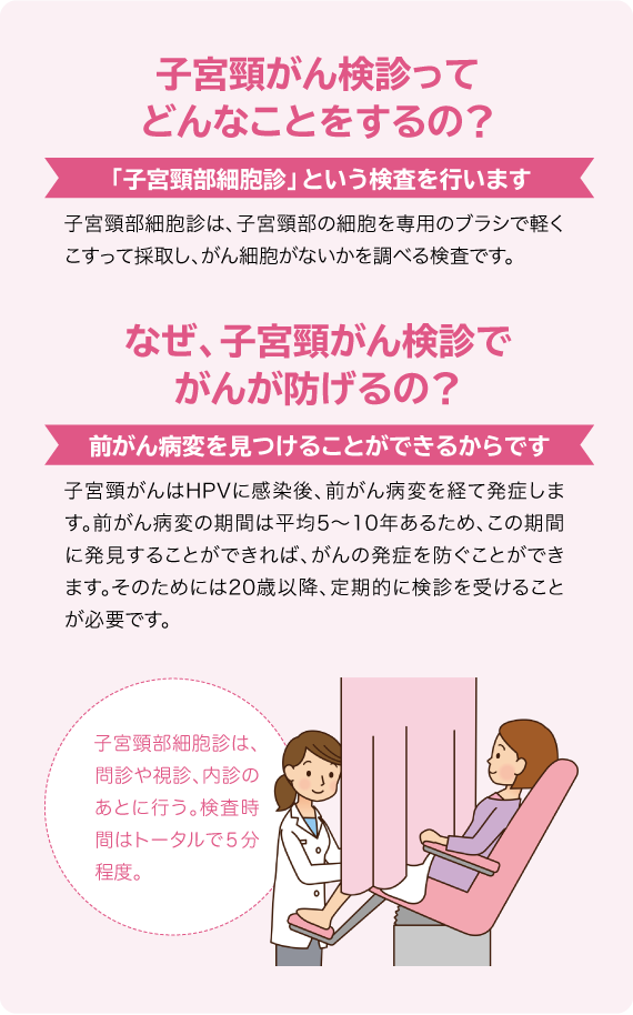子宮頸がんは進行するまで自覚症状がなく、進行してから見つかると子宮を失うことになります。そのため、症状がなくても20歳をすぎたら2年に1回、子宮頸がん検診を受けましょう。この検診はがん発症の予防にもつながり、実際、受診率が高い欧米諸国では子宮頸がんの発症率が低下しています。