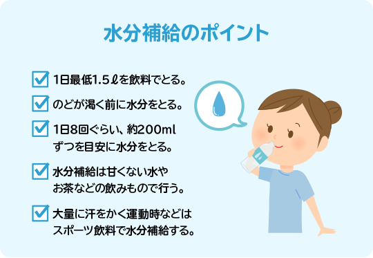 タイミングは「起床時」「朝食時」「午前の休憩時」「昼食時」「午後の休憩時」「夕食時」「入浴前後」「就寝前」の8回ぐらいが目安で、計画的に、そして汗をかいたらそのつど水分をとりましょう。