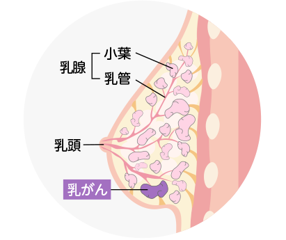 乳がんは乳房全体に放射状に広がる乳腺にでき、がんが1㎝大ぐらいになると乳房を触ったときしこりとしてわかるようになります。実際、乳がんの約6割は、しこりなどの乳房の変化に気づくことで発見されています。