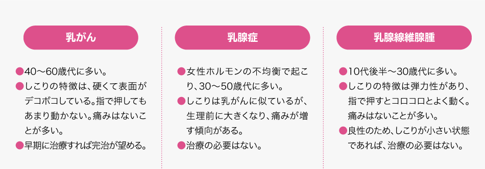 ただし、乳腺症や乳腺線維腺腫でも乳房に良性のしこりがみられるため、しこりのようすだけでは乳がんかどうかわかりませんが、見過ごさないことが大切です。