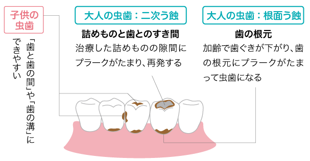 大人の虫歯で多いのは、治療済みの歯に虫歯が再発する「二次う蝕」や、歯の根元が虫歯になる「根面う蝕」。いずれも自分で見つけにくいうえ、痛みがでにくい特徴があります。