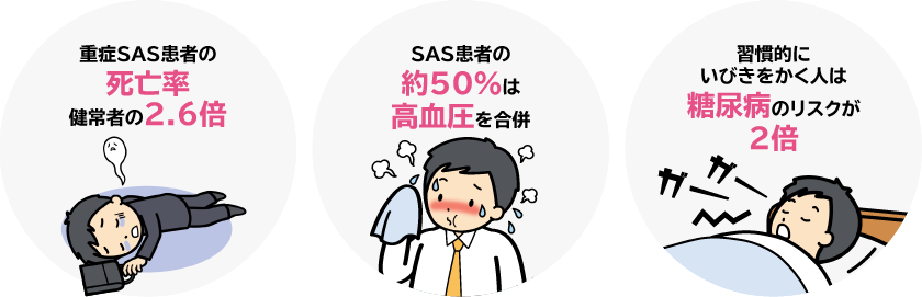 メタボリックシンドロームと密接な関係があり、サイレントキラーと呼ばれる「糖尿病」・「高脂血症」・「高血圧」・「肥満」に「睡眠時無呼吸症候群(SAS)」を加え、「死の五重奏」といわれるようになりました。