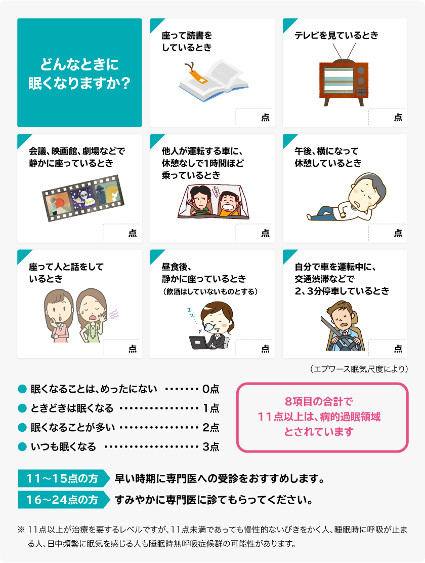 いびきや、日中の眠気、熟睡感のなさ、起床時の頭痛、眠っている間に呼吸が止まる、などの症状に心当たりのある方は、下に示した「眠気テスト」を行ってみてください。