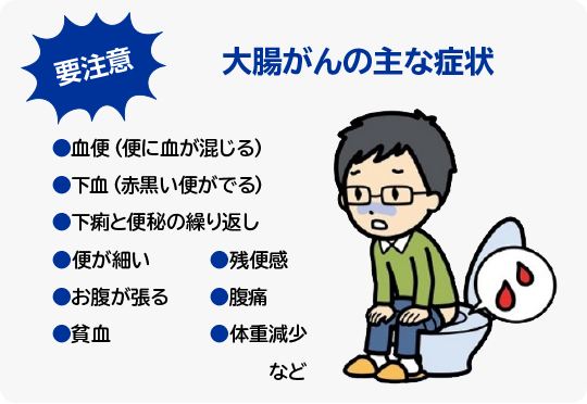がんが大きくなると血便や下血、下痢と便秘の繰り返し、便が細いなどの症状がみられます。ただし、血便や下血は痔と勘違いして放置されやすく、便通異常なども特別な症状ではないため見過ごされがち。そのため、がんが見つかった時にはかなり進行している場合があります。