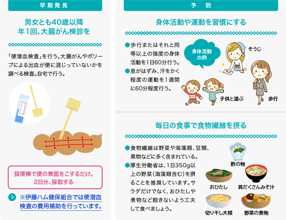大腸がんは日本人に最も多いがん。その理由として、食の欧米化や便利な生活による運動不足といった生活習慣の変化が指摘されています。当健保組合でも増加傾向にあり、特に40歳以上の男性に高い傾向がみられます。早期発見のためには、大腸がん検診を受けることが大切です。また、血便や下血、下痢と便秘の繰り返しなどの症状があれば、早めに医療機関を受診しましょう。