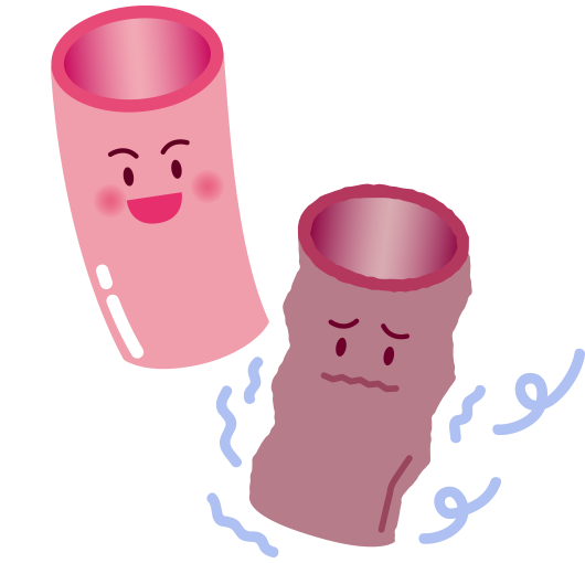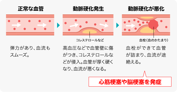 血管が厚く硬くなり、弾力が失われていく動脈硬化。血管の老化現象ですが、高血圧や脂質異常症、糖尿病、肥満、喫煙も危険因子です。特に心臓や脳の血管に生じやすく、冬は寒さで血圧が上がりやすいため、悪化すると血管が詰まってしまい、合併症を起こす危険性が高まります。そのため、冬は心筋梗塞や脳梗塞などを発症する人が増加します。