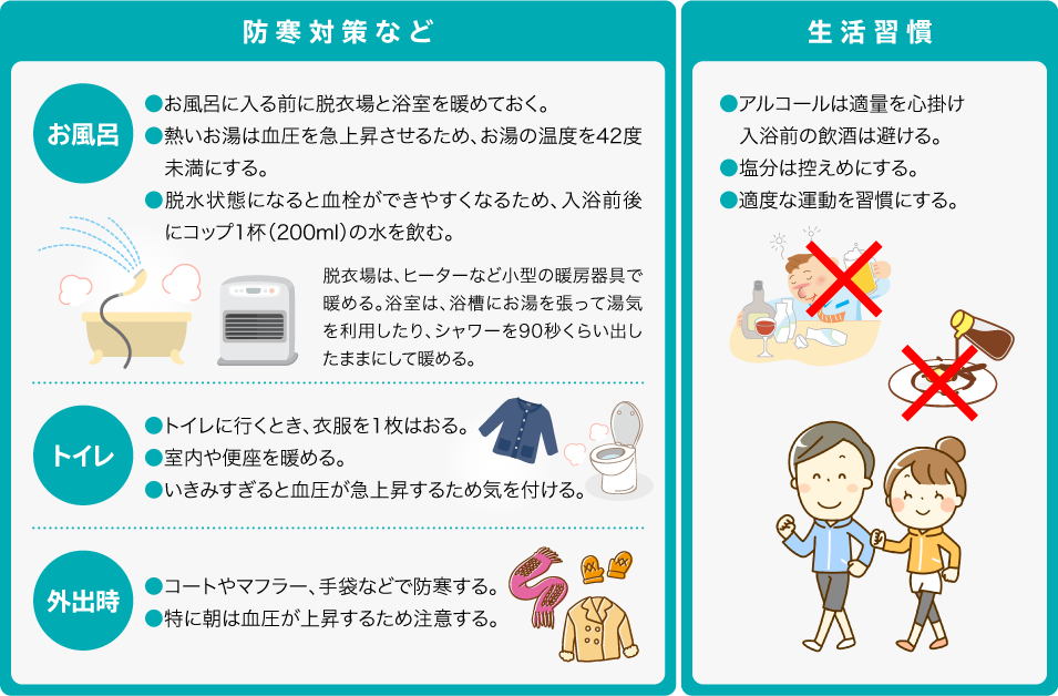 冬に気を付けたい急な寒暖差は、暖かい屋内から寒い屋外に出たときや、暖かい部屋から寒いお風呂場やトイレなどに移動したとき。家の中でも衣服や暖房器具で防寒対策を行い、血圧の急上昇を防ぐことが大切です。