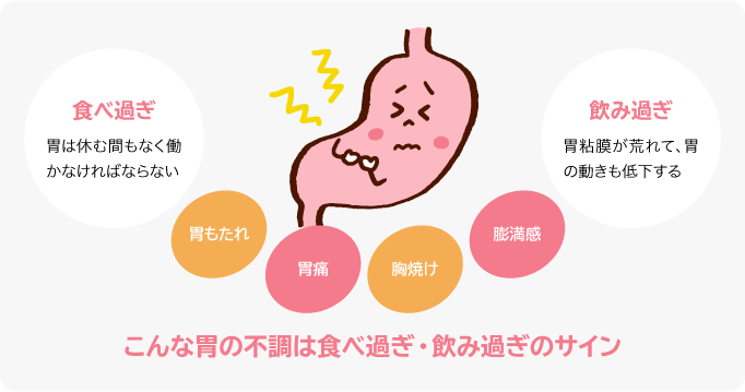 食べ過ぎ・飲み過ぎは、胃に大きな負担をかけることになります。胃もたれなどの不調はそれを知らせるサインです。