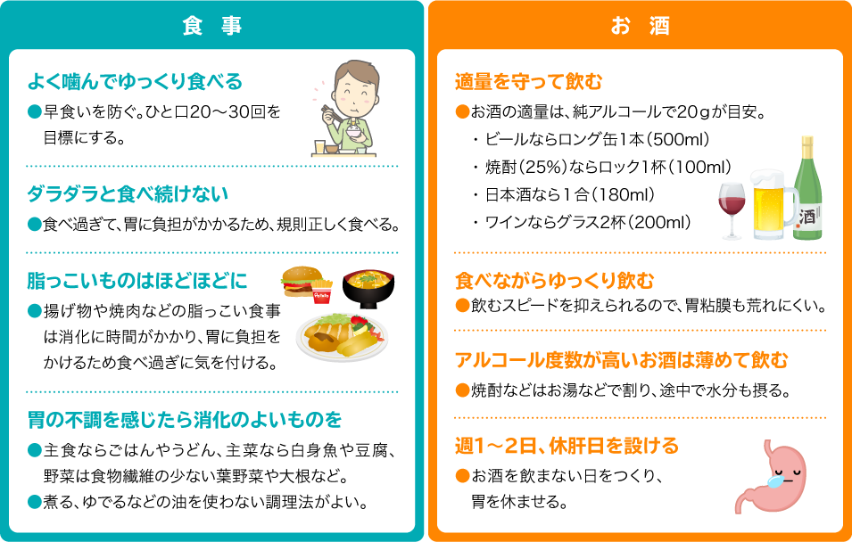 食べ過ぎ・飲み過ぎを防ぐ大原則は、ゆっくりと味わうこと。また、食べない・飲まない時間を設けて胃を休ませることも、胃の不調を予防・改善する上で重要です。胃に不調を感じると市販の胃薬を飲んでやり過ごす人がいますが、それはあくまでも応急処置。食べ方・飲み方を見直して、胃をすこやかに保ちましょう。