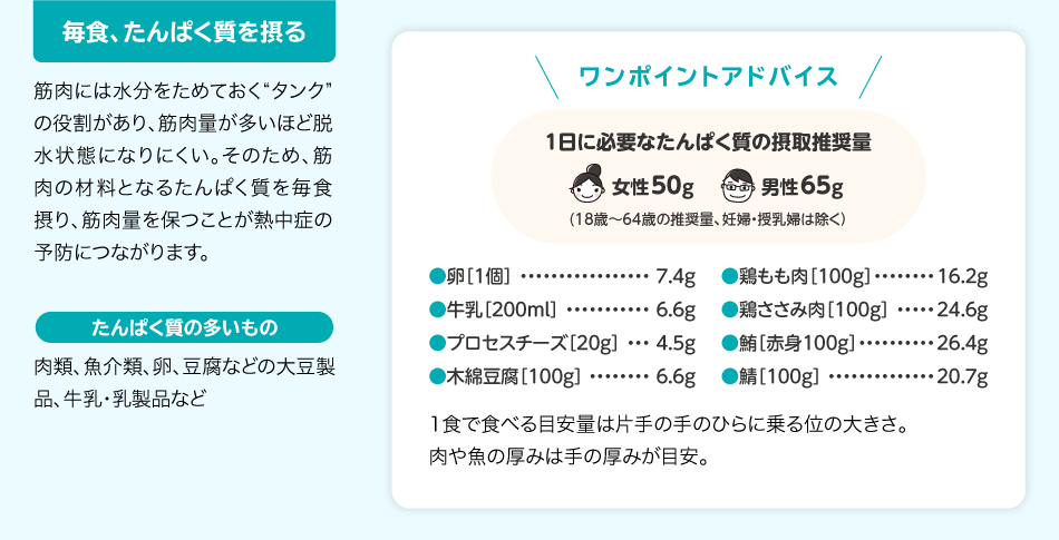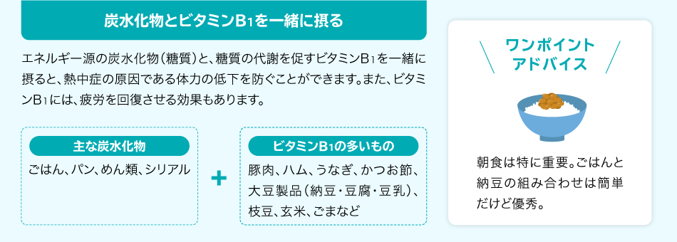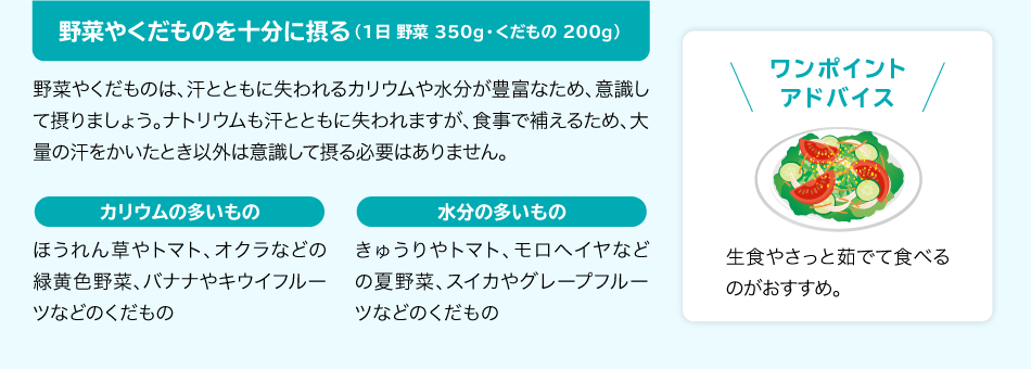 7月から8月の急に暑さが増すこの時期は、体がだるい、食欲がわかない、眠れないなど、体調を崩す人が多くなります。体が暑さに慣れていないため、熱中症になりやすく注意が必要です。熱中症を防ぐためには1日3食、バランス良く食べることが大切です。水分補給だけでなく、日頃から特定の栄養素を含んだ食事を摂ることで、暑さに負けない体づくりをしましょう。