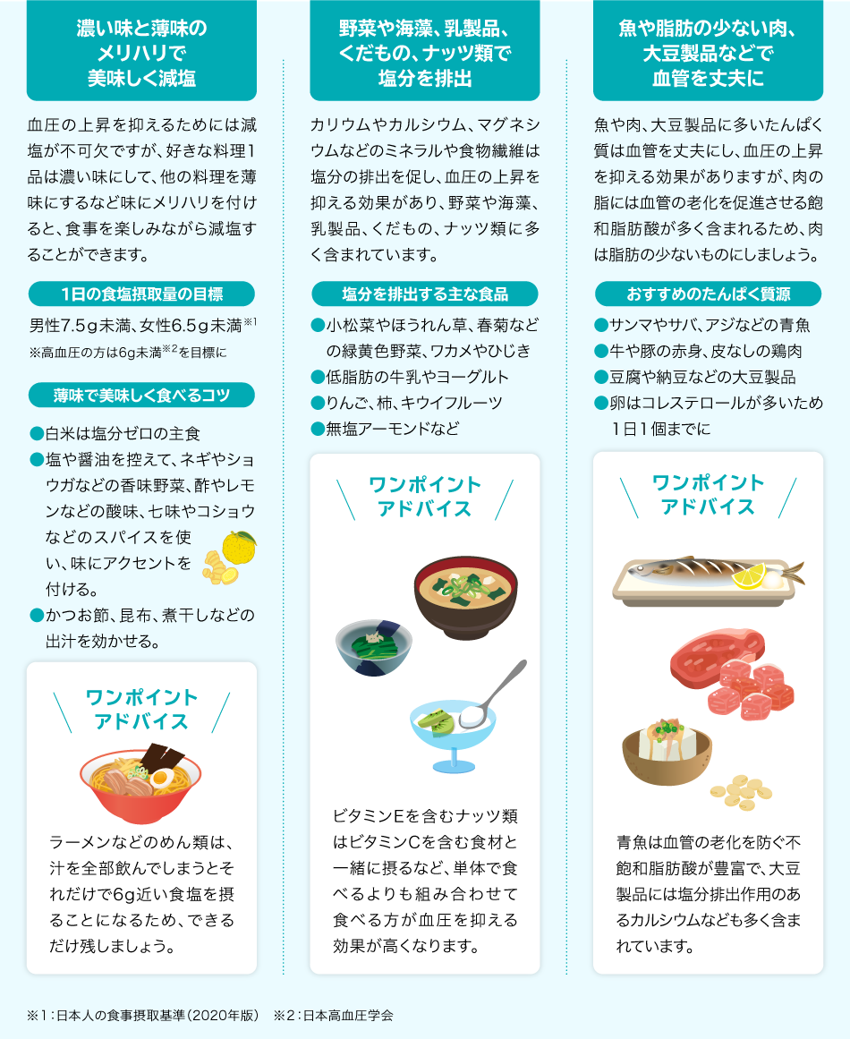 年齢とともに高血圧の方の割合は高くなり、血管も老化していきます。高血圧の症状は、男性では40歳代から増え始めるのに対し、女性では50歳代から増え始めます。日本人は塩分摂取量が多く、それが血圧を上げる最大の要因になっています。自覚症状のないまま発症し、放置していると血管の老化を促進させるため、心筋梗塞や脳梗塞などの重大な病気を引き起こします。高血圧のほとんどは、動脈硬化が原因の生活習慣病といえるので、生活習慣を見直すことで改善できます。血管の若さを保つために、血圧の上昇を抑える食べ方を心がけましょう。