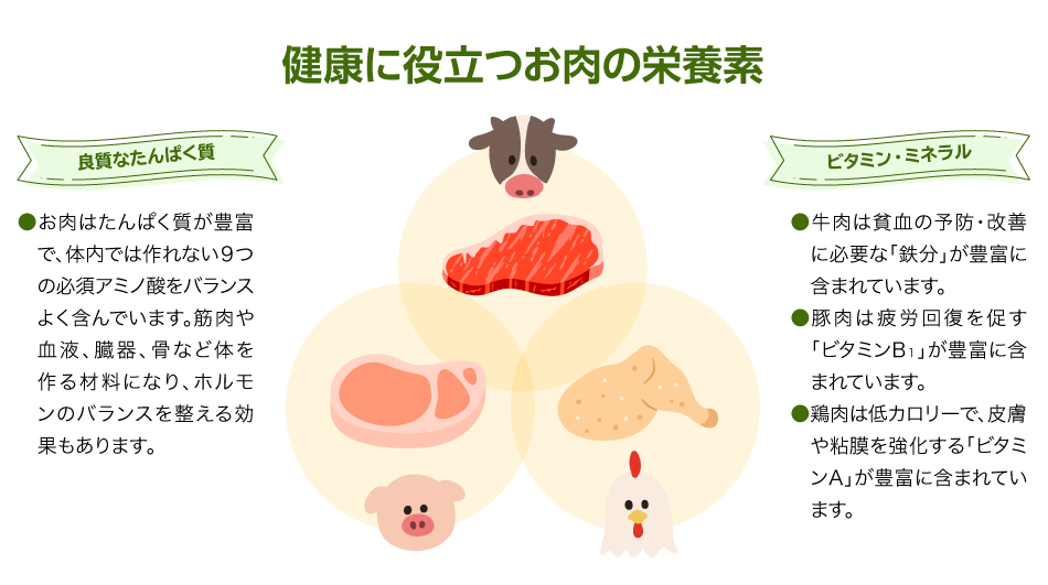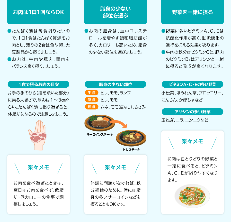 カロリーなどを気にして、お肉をガマンしていませんか。お肉は食べ過ぎると血中コレステロールが増えて動脈硬化のリスクが高まりますが、体に欠かせない栄養素が豊富に含まれています。上手にお肉を摂り入れて、バランスの良い食事を心掛けましょう。