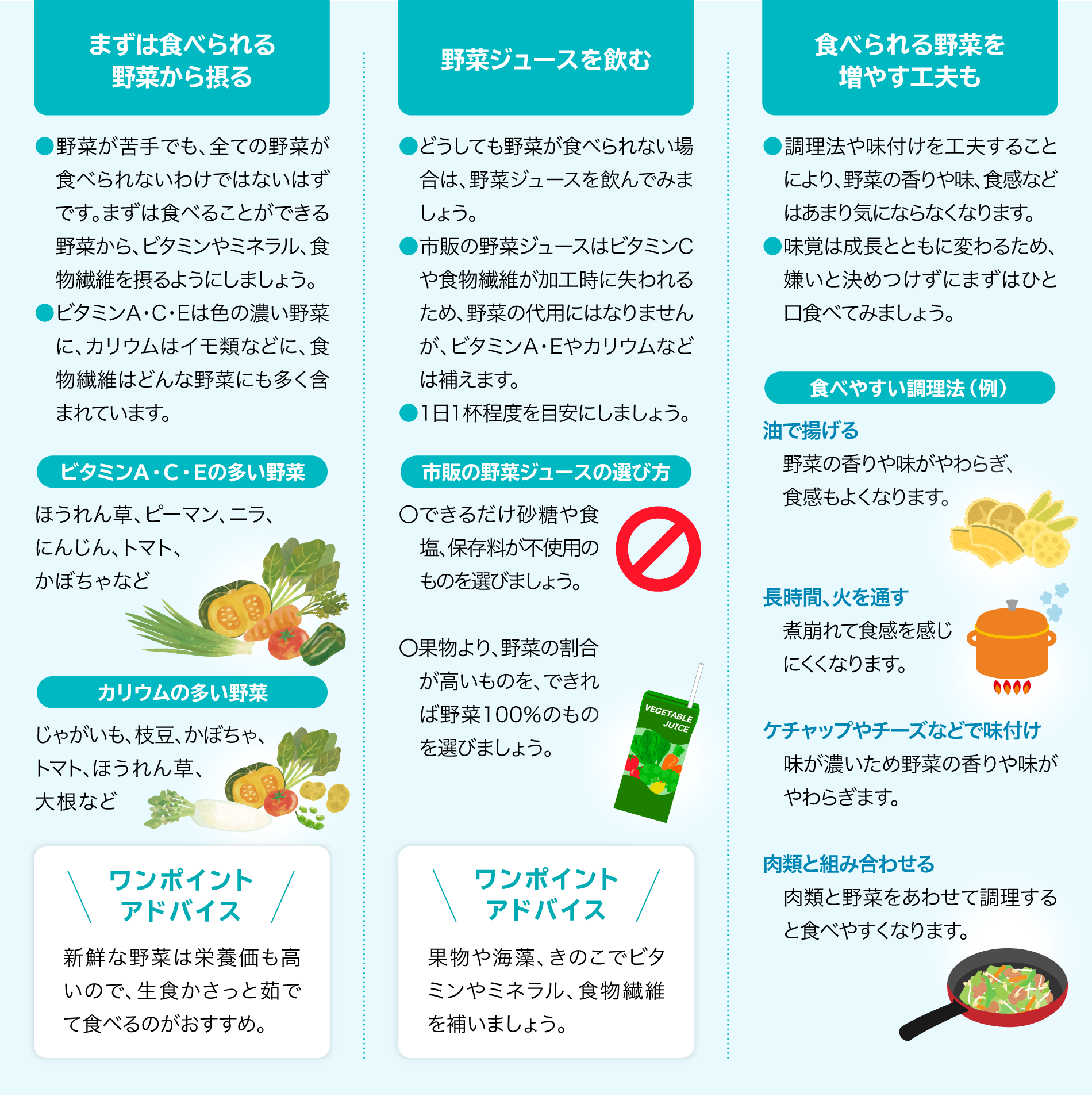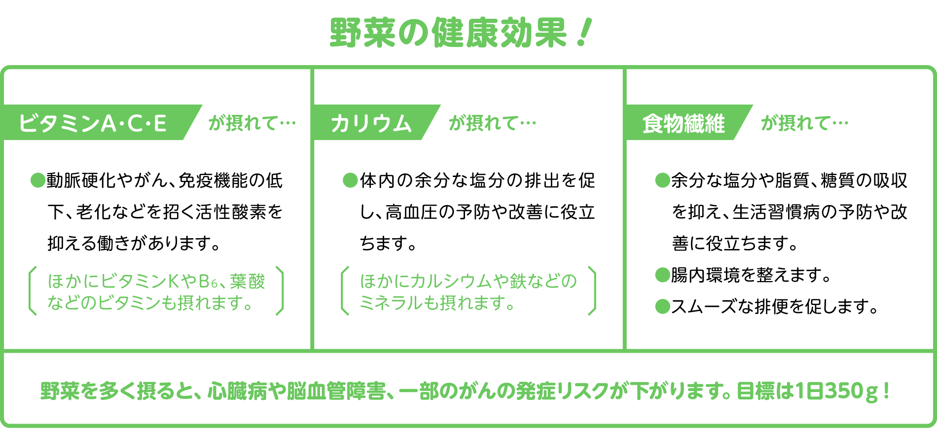 子どもだけでなく、大人でも苦手な人が多い野菜。しかし、野菜は健康を維持・増進する上で欠かせないものです。野菜にはビタミンやミネラル、食物繊維が多く含まれていますが、これらの栄養素は体内で生産されないため、不足すると体にさまざまな不調が出てきてしまいます。野菜を摂ることで得られる健康効果を知り、少しでも野菜を摂れるよう工夫してみましょう。