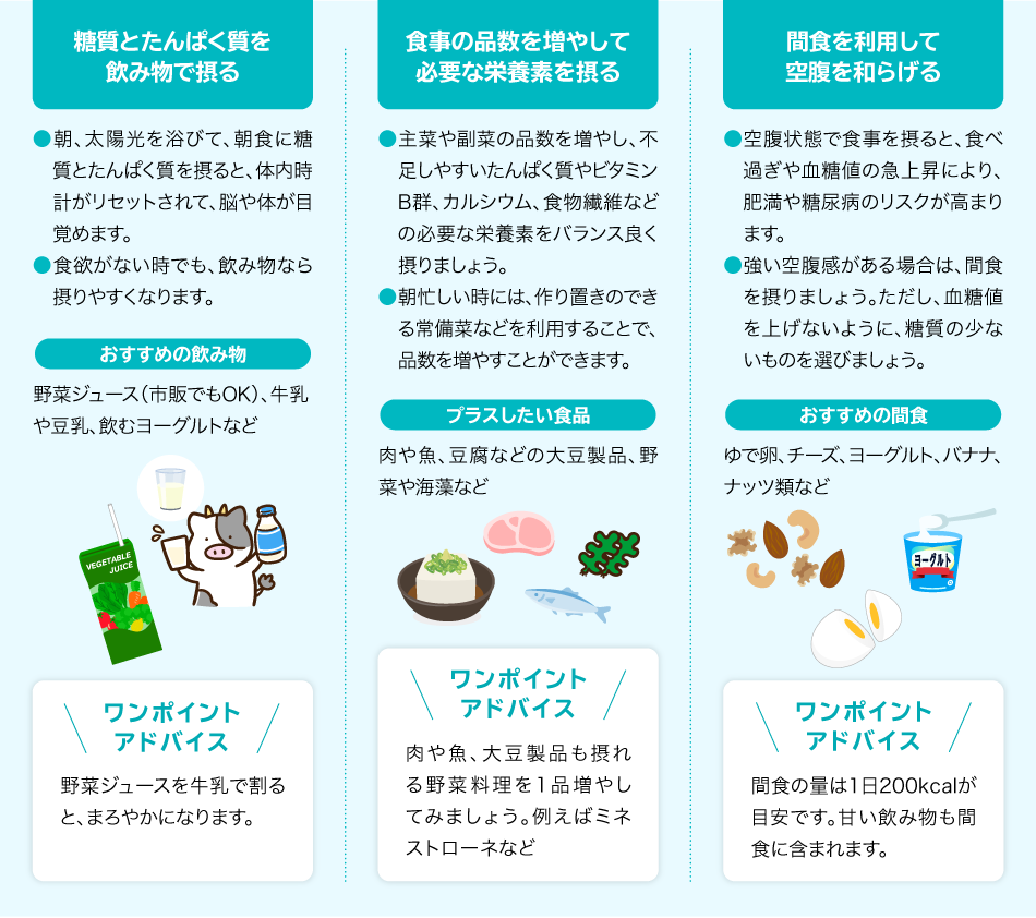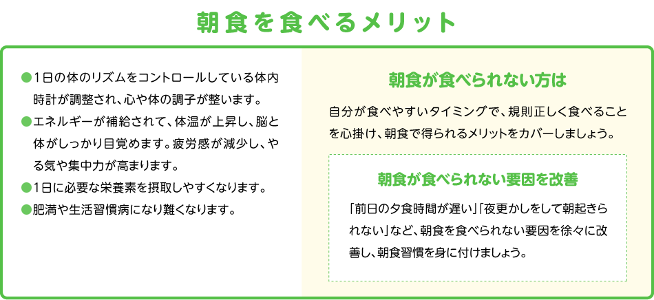 朝食は、1日の生活をスタートさせる活力源であり、健康を維持するためにも重要ですが、生活時間の変化などの影響により朝食が食べられない方が増えています。朝食には胃袋を満たすためだけでなく、大切な役割があります。朝食を抜くのではなく、まずは自分の体や生活に合ったリズムで、朝食を食べる工夫をしてみましょう。