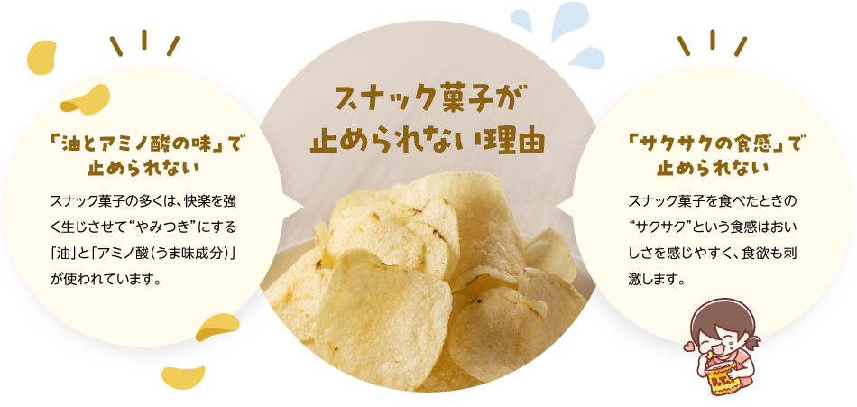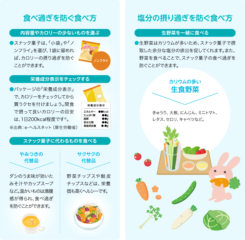 食べ始めると止められなくなるスナック菓子。サクサクとした軽い食感のため食べ過ぎてしまう方、食べ残したら湿気るからと全部食べてしまう方も多いはず。しかし、ポテトチップスやコーンスナックなどはカロリーが高く、塩分や脂肪分も多いので、食べ過ぎが続くと高血圧や肥満につながり体に悪影響を及ぼします。スナック菓子の選び方や食べ方を工夫してみましょう。