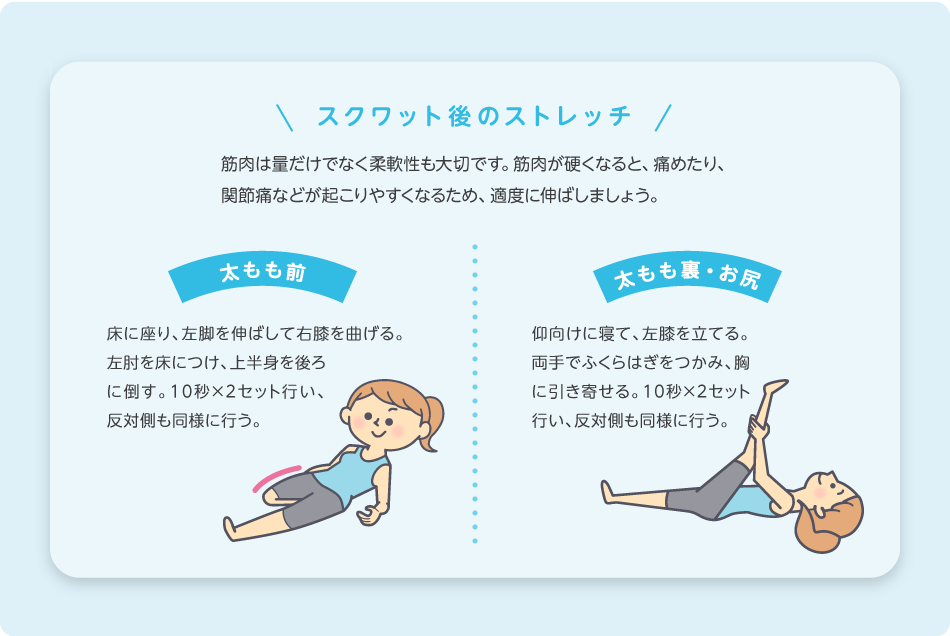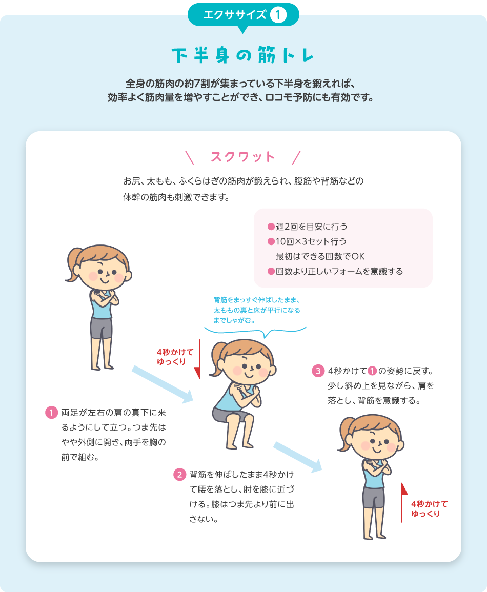 ロコモ(ロコモティブシンドローム)とは、筋力の低下やバランス能力の低下、骨粗しょう症や変形性膝関節症などの骨や関節の病気によって、立つ、歩くといった移動機能が低下した状態です。ロコモ自体は病気ではありませんが、ロコモによる運動不足が肥満などの生活習慣病を併発しやすくし、ロコモが進行すると、将来寝たきりや要介護になるリスクが高まります。いつまでも自分の足で歩き続けていくために、筋トレを習慣化して筋肉量を増やし、ロコモを予防していきましょう。