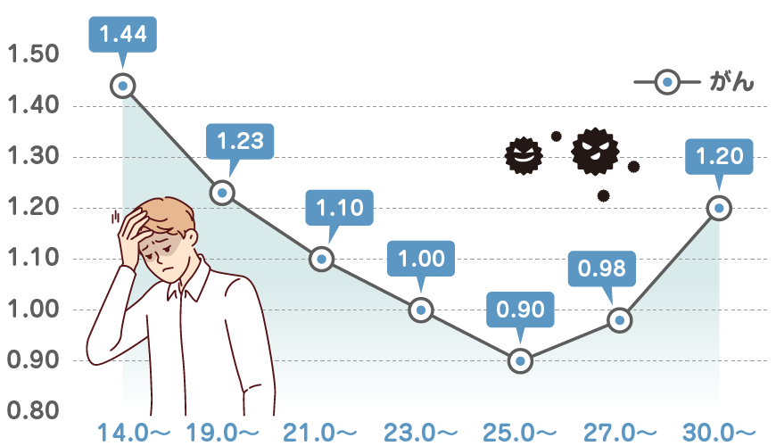 男性16万人を対象にした国立がん研究センターの調査では、死亡リスクが低いBMI23.0~24.9の人のがんの死亡率を1とした場合、痩せ過ぎている人(BMI14.0~18.9)は1.44、太り過ぎている人(BMI30.0以上)は1.20となっており、太っている人よりも痩せている人の方が、がんの死亡リスクが高いことが分かっています。