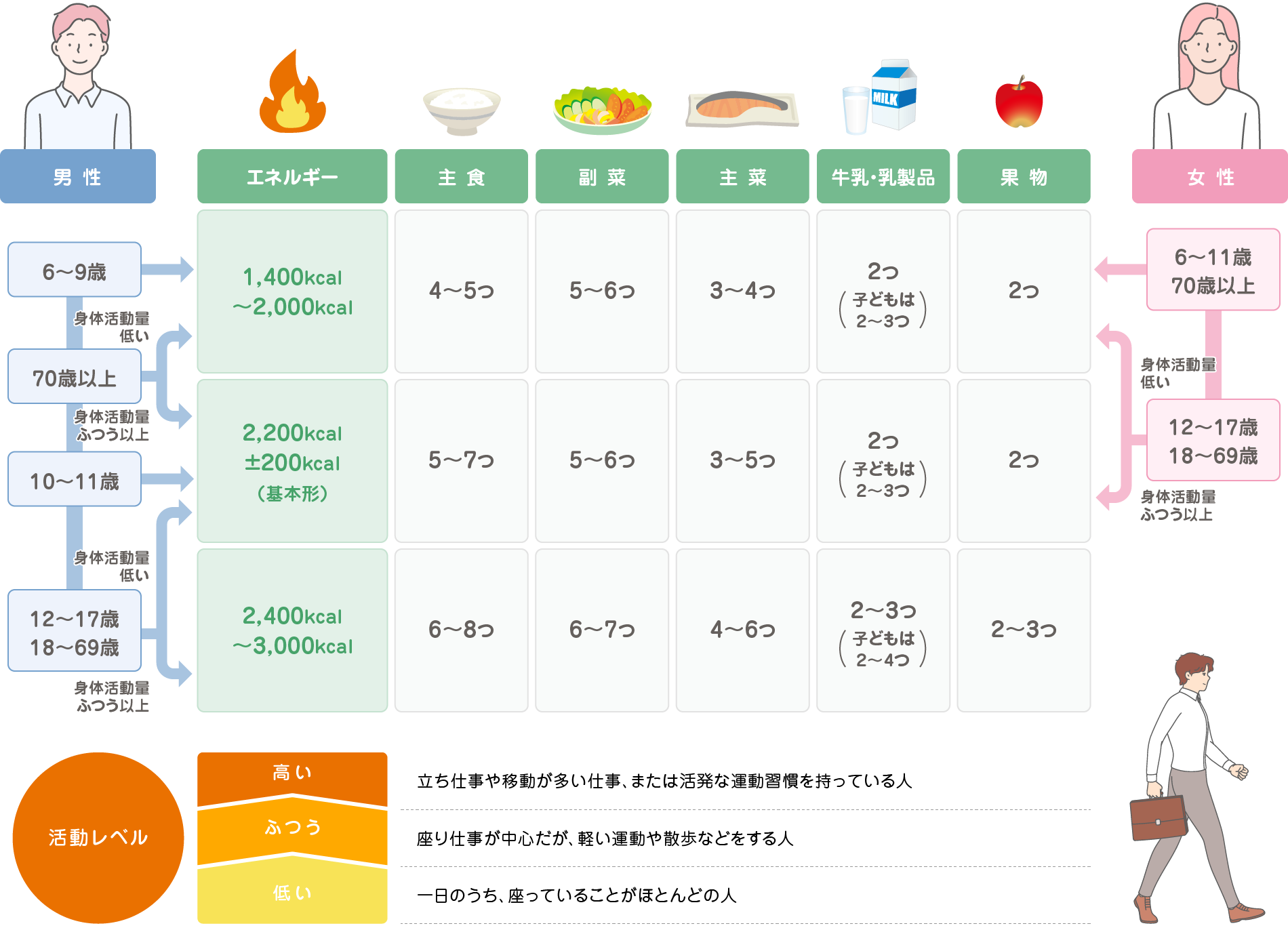 1日に必要なエネルギー量と摂取の目安は、性別、年齢、身体活動レベルによって異なります。自分にとって適正な食事量の目安を知り、食生活を振り返ってみましょう。